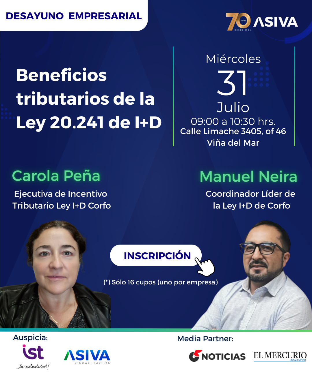 Este encuentro será liderado por Carola Peña, ejecutiva de Incentivo Tributario Ley I+D de Corfo y *Manuel Neira , Coordinador Líder de la Ley I+D de Corfo, quienes entregarán herramientas claves para que las empresas puedan acceder a incentivos fiscales que fomenten la innovación y el desarrollo tecnológico.