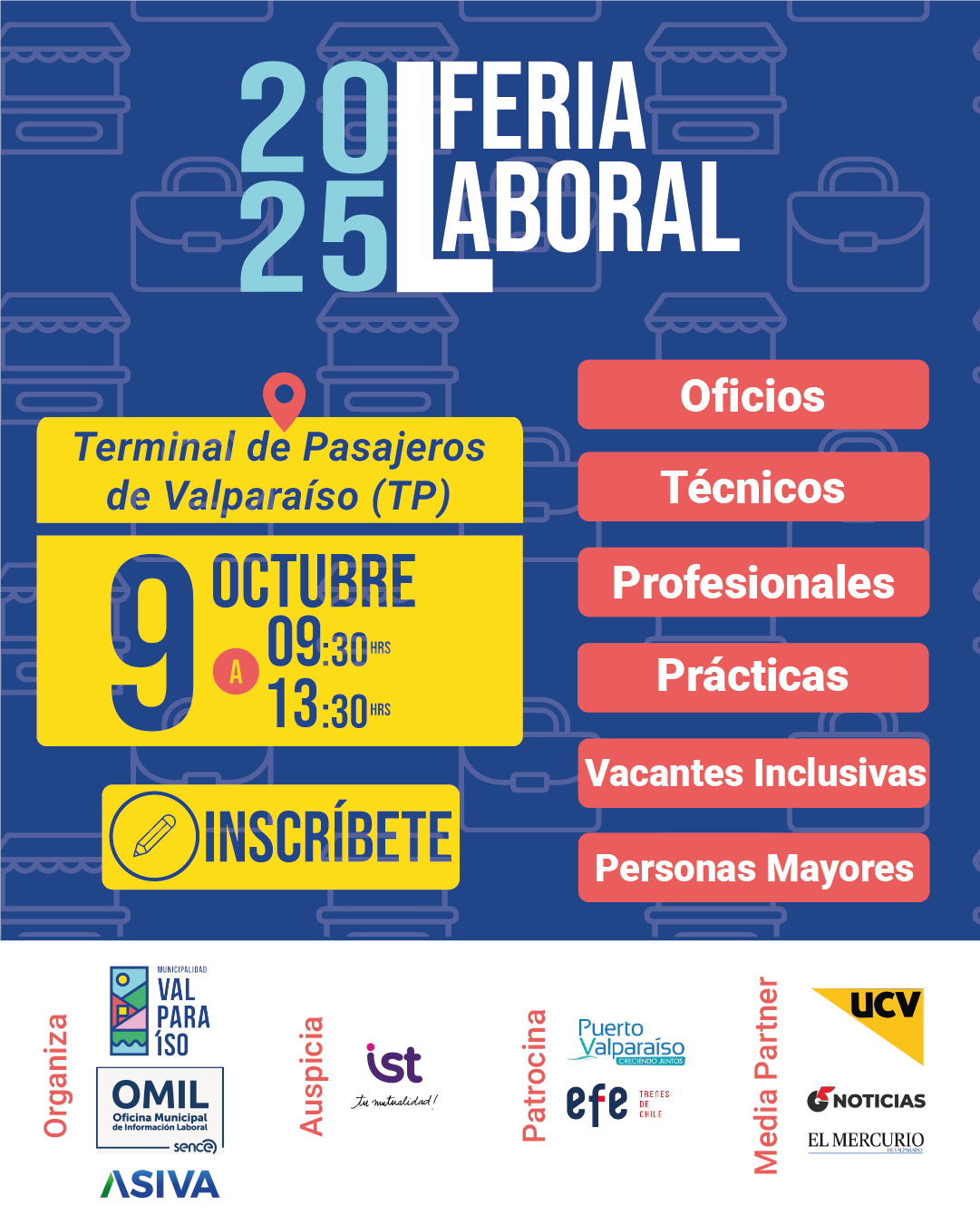 La Municipalidad de Valparaíso, ASIVA y OMIL te invitan a ser parte de esta gran instancia donde encontrarás una amplia variedad de oportunidades laborales para distintos perfiles y niveles de experiencia: técnicos, profesionales, operativos y de apoyo. ¡Hay alternativas para quienes buscan su primer empleo y también para quienes desean proyectar su carrera!