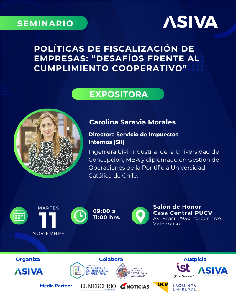 ASIVA, en colaboración con la Comisión de Impuestos y Cumplimiento Empresarial , junto con la Pontificia Universidad Católica de Valparaíso, invita a participar en el seminario “Políticas de Fiscalización de Empresas: Desafíos frente al Cumplimiento Cooperativo”, un espacio de encuentro entre autoridades y empresas para reflexionar sobre los desafíos del cumplimiento cooperativo, impulsando una fiscalización más efectiva, participativa y orientada a la mejora continua.