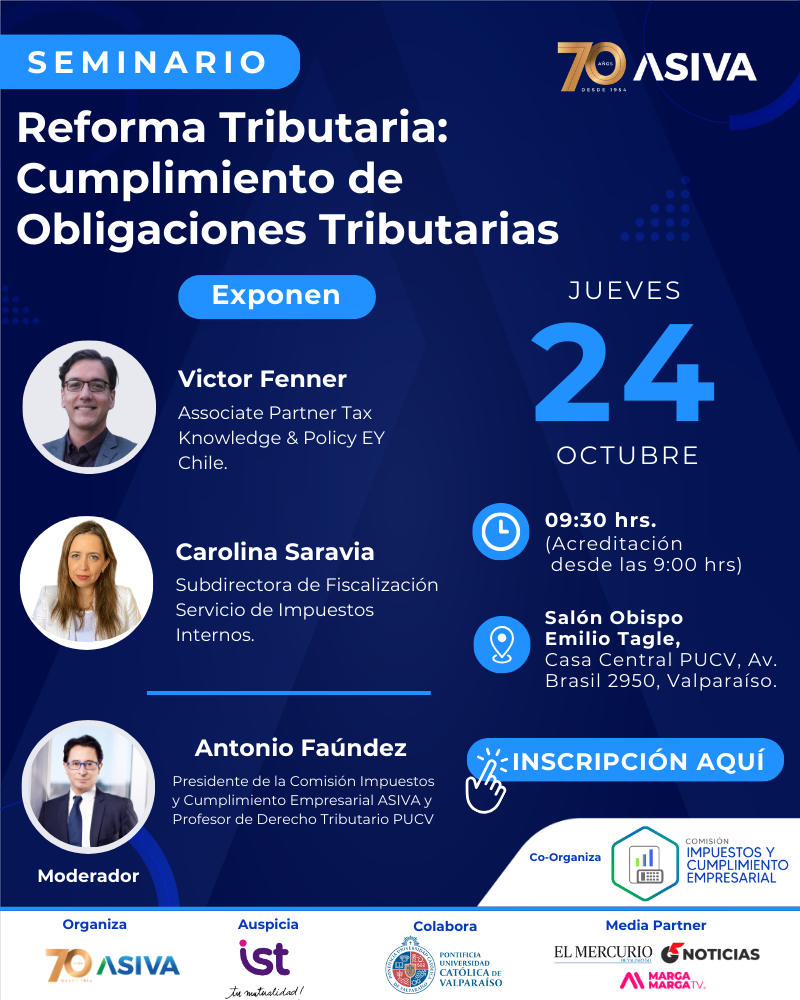 Esta instancia organizada por ASIVA junto a su Comisión de Impuestos y Cumplimiento Empresarial, en colaboración con la Pontificia Universidad , busca profundizar en los detalles más importantes de la nueva Reforma Tributaria y su funcionamiento.