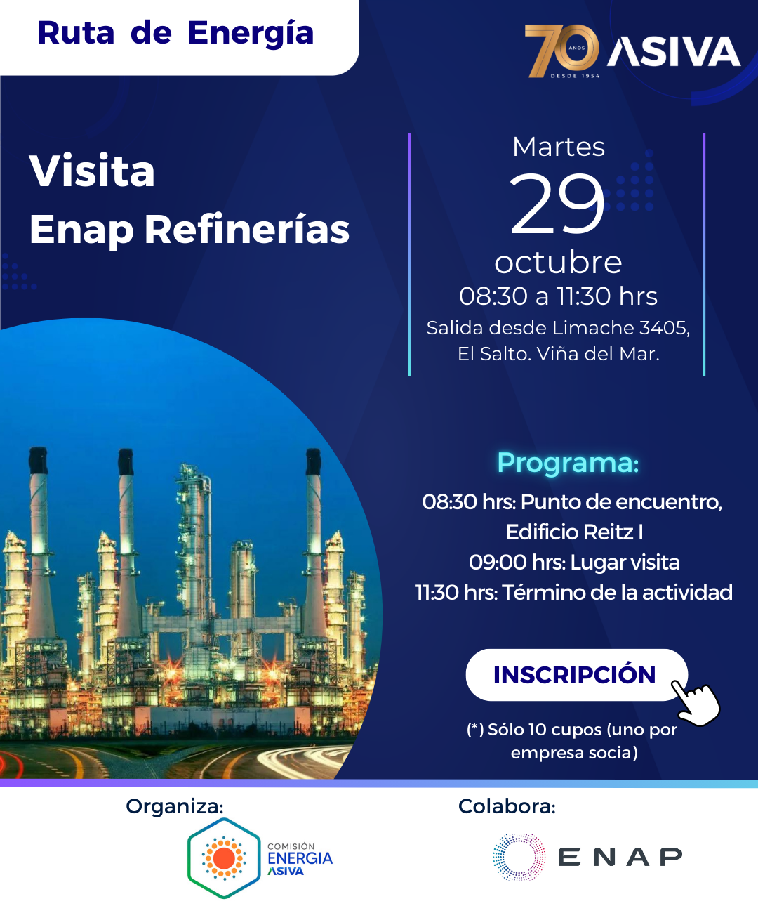 La Asociación de Empresas Región Valparaíso-ASIVA en colaboración con su Comisión de Energía, invita a sus asociados a participar en la Ruta de Energía donde visitarán las inmediaciones de la Refinería de ENAP.